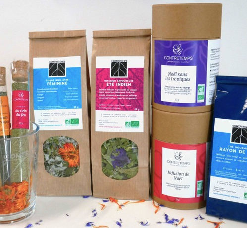 Contretemps, ce sont des infusions et des tisanes, bio, vivantes et colorées - mais aussi des thés aux plantes et des condiments (sels aux herbes, sucres au fleurs, aromates). Pour Noël, on a créé spécialement une infusion et un thé ! Toutes les plantes (hors thé) sont cultivées et transformées à la main sur notre ferme située à Gelles.